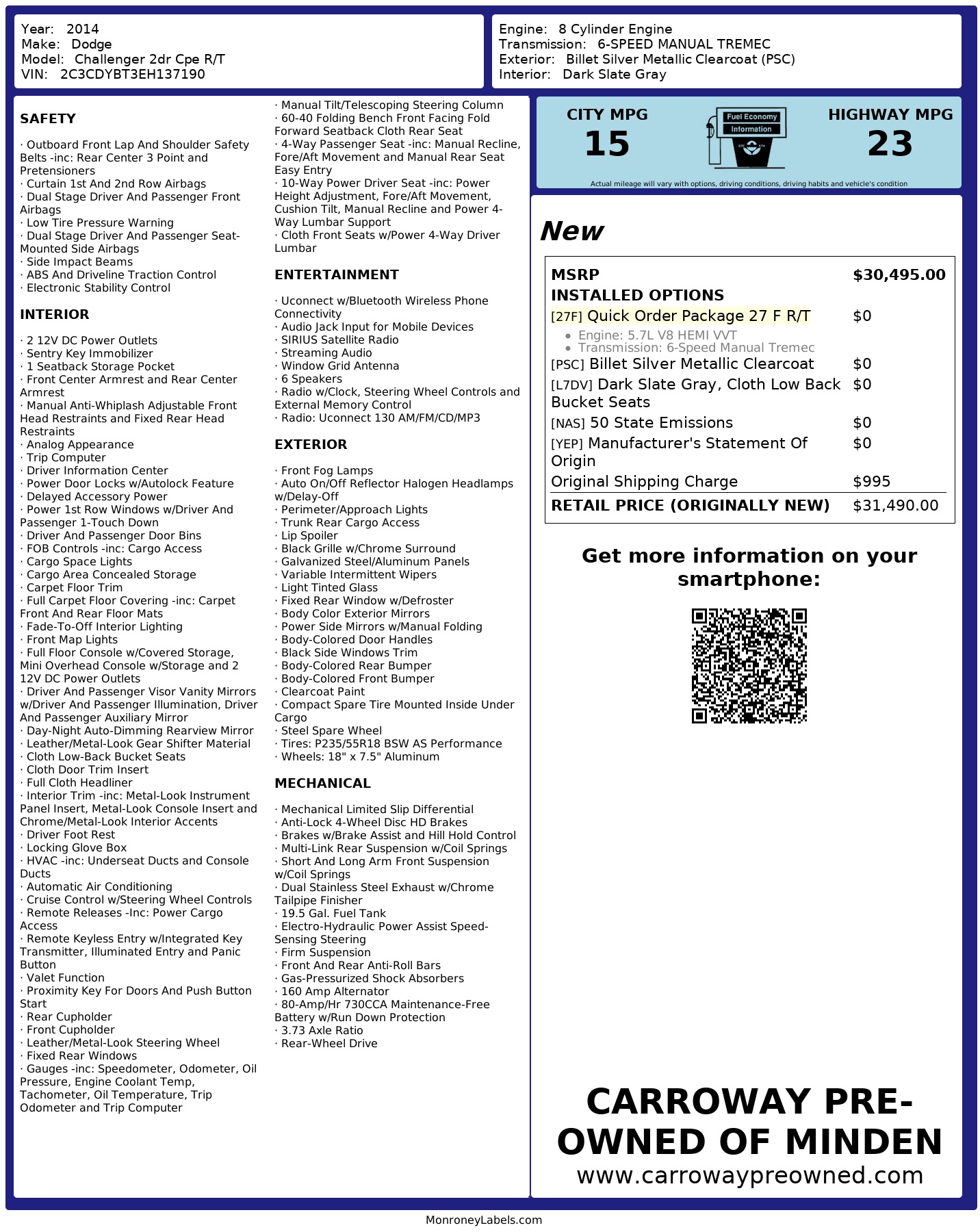 Get ready to turn heads in this sleek Silver 2014 Dodge Challenger! Its powerful engine will have you zooming down the road with a smile on your face, while the comfortable interior and smooth handling make every drive a joy. This beauty comes with a Carfax report, so you can rest easy knowing its history is as clean as its exterior. From the stylish design to the impressive performance, this Challenger is sure to make every drive an unforgettable experience. Don't miss out on your chance to own this fantastic ride!
